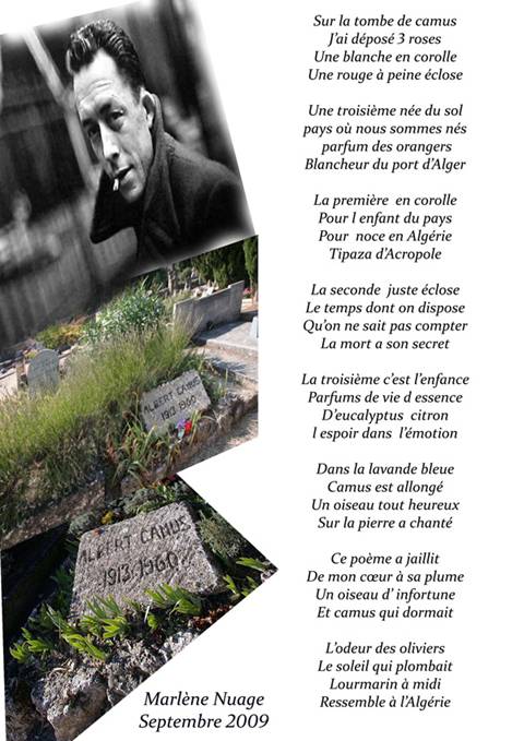 | 2433 | Quel délice J’étais à Matares début octobre dans un périple culturel où j’ai récité mes poèmes et lu Camus le Magnifique. Merci infiniment pour ces cadeaux photos qui ensoleillent ma matinée et je vous joins une poésie de ma composition encor merci et bravo. Marlène | 05/12/2009 |